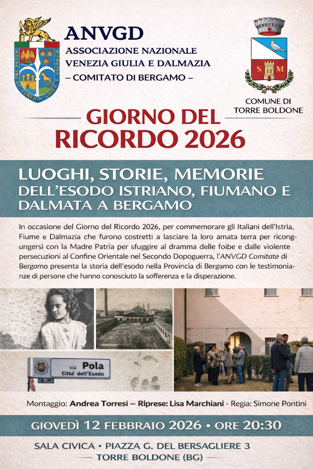 In occasione del Giorno del Ricordo 2026, per commemorare gli Italiani dell'Istria, Fiume e Dalmazia che furono costretti a lasciare le loro amate terre per ricongiungersi con la Madre Patria per sfuggire al dramma delle foibe e delle violente persecuzioni al Confine Orientale nel Secondo Dopoguerra, l'ANVGD Comitato di Bergamo presenta la storia dell’esodo nella Provincia di Bergamo con le testimonianze di persone che hanno conosciuto la sofferenza e la disperazione dell'esilio