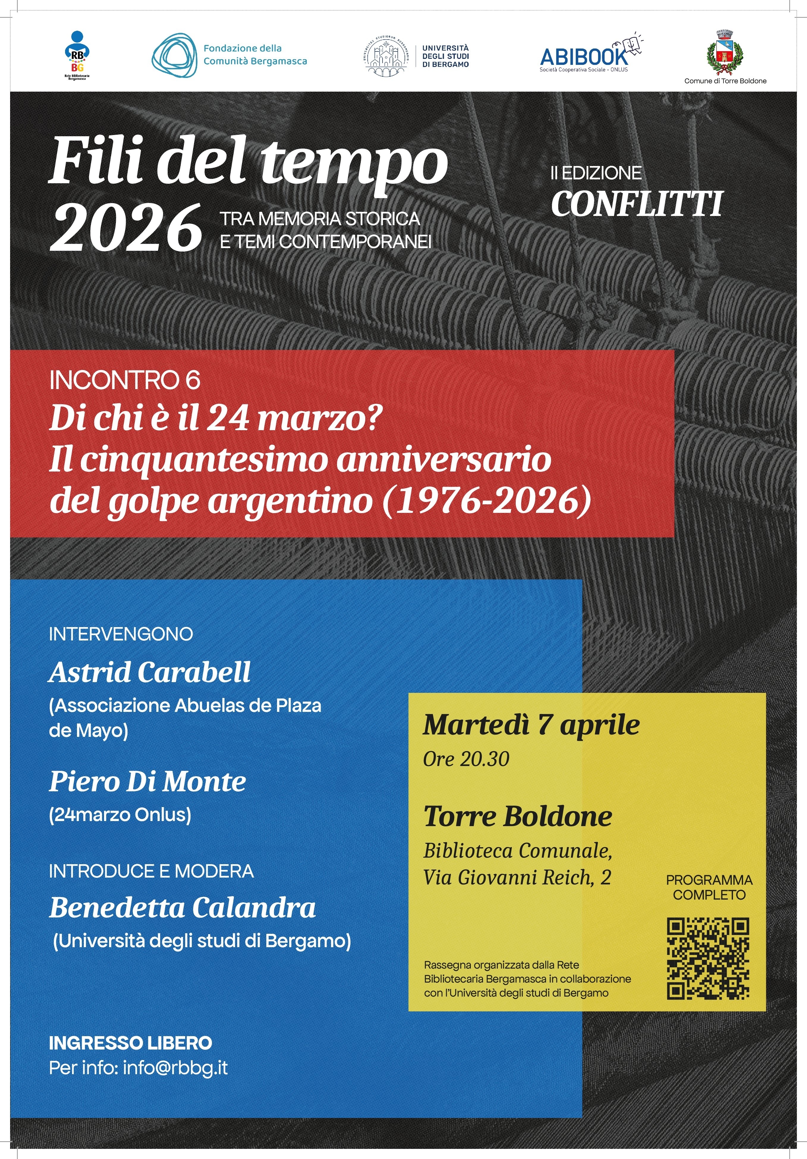 La Biblioteca di Torre Boldone organizza, con l'Università degli Studi di Bergamo, un incontro all' interno della rassegna "Fili del tempo 2026, tra memoria storica e temi contemporanei" il 7 aprile alle ore 20.30 presso la biblioteca di Torre Boldone.