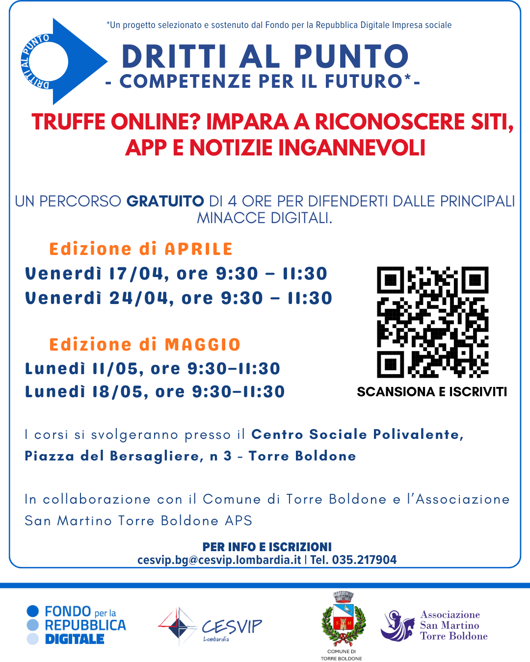 L'iniziativa è possibile grazie alla collaborazione fra Comune di Torre Boldone, Cesvip e Associazione San Martino Torre Boldone APS, con un finanziamento del Fondo per la Repubblica Digitale. I corsi saranno tenuti dall'esperto G. Battista Zibetti.
