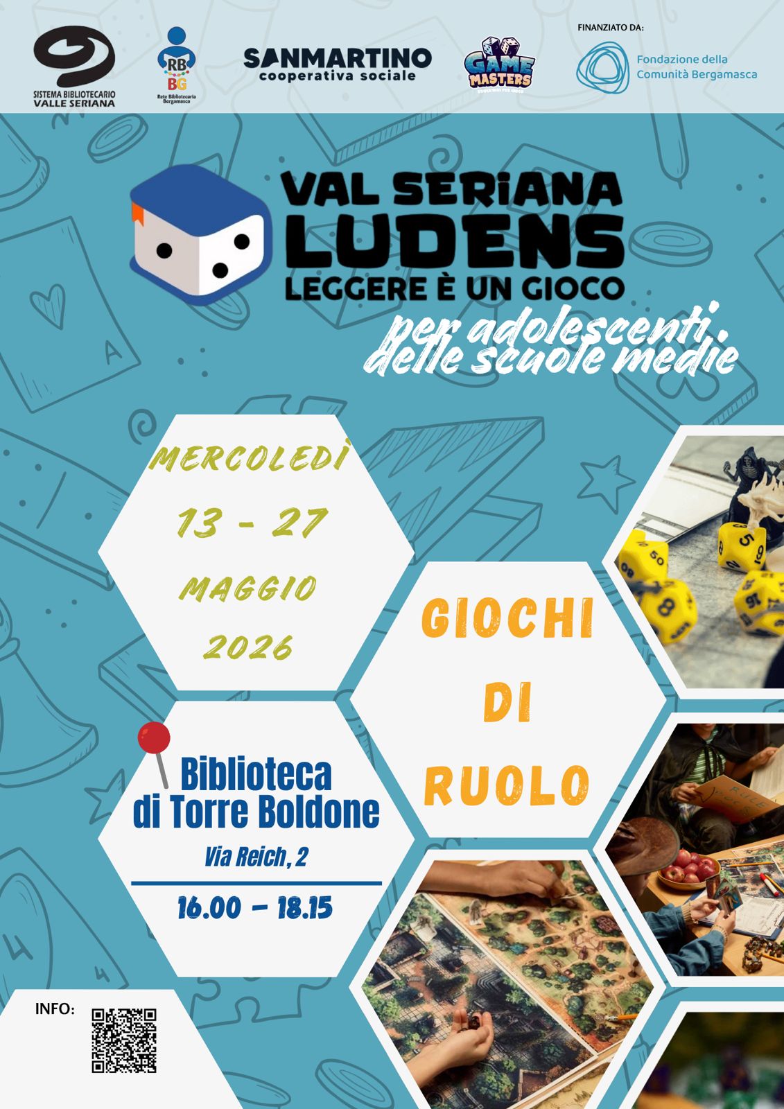 Prende il via «Val Seriana Ludens - Leggere è un gioco», il ciclo di appuntamenti di giochi da tavolo e di ruolo in biblioteca, promosso dal Sistema Bibliotecario Valle Seriana, in collaborazione con la cooperativa San Martino Progetto Autonomia e con il sostegno della Fondazione della Comunità Bergamasca.